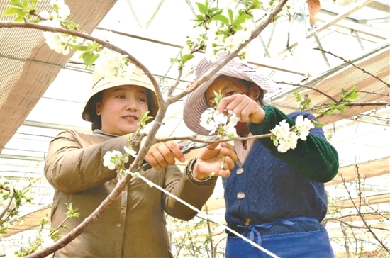一條條有機(jī)基質(zhì)槽均勻分布,一座座日光溫室拔地而起。4月是車?yán)遄訕溟_花的時(shí)節(jié),走進(jìn)位于烏米組的車?yán)遄臃N植大棚,就能看到車?yán)遄踊ǜ?jìng)相綻放,一簇簇白色的花朵開滿枝頭,在綠葉和枝干的映襯下,格外賞心悅目。置身于一片花海的當(dāng)?shù)貏?wù)工人員正搶抓農(nóng)時(shí),為果樹疏剪花枝、人工授粉,大家各司其職、分工合作,一派熱火朝天的勞動(dòng)場(chǎng)景。