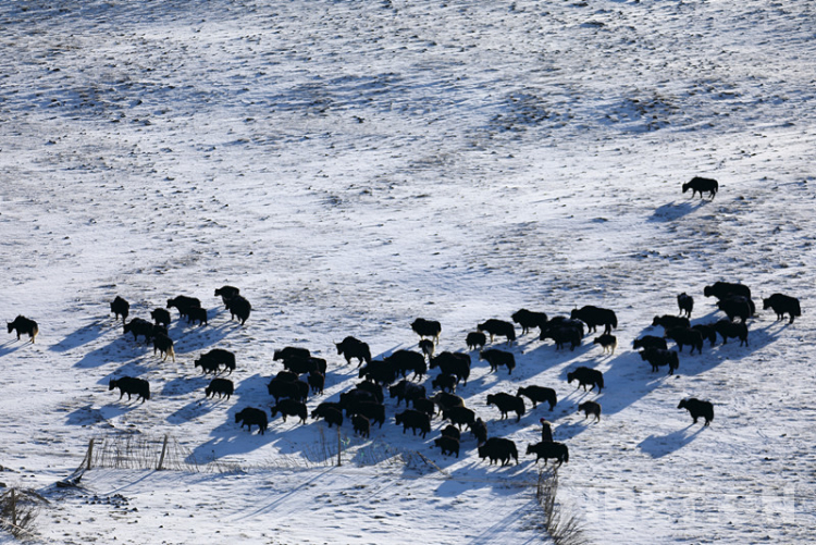 中國(guó)西藏網(wǎng)訊 “噓、噓……” 4月27日,在海拔4200多米的四川省甘孜藏族自治州理塘縣奔戈鄉(xiāng)卡灰村牧場(chǎng)上,雪后初霽,牧民洛絨赤乃吆喝著一大群牦牛在雪地覓草。