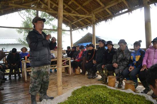 雨越下越大,格桑把村民們叫到茶葉基地旁邊的茅草屋避雨,借此機會,他又用門巴語講解了民族團結(jié)、掃黑除惡、醫(yī)療報銷等方面的內(nèi)容,這中間還穿插一些漢語的講解。