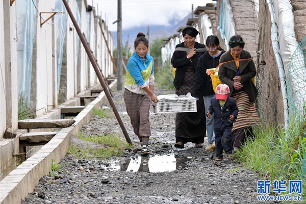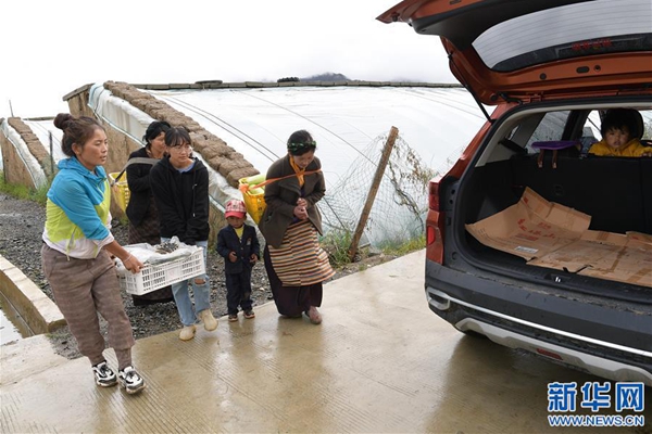 格桑旺姆(左三)和姐姐德吉卓瑪(左一)帶領雇傭的殘障村民巴珍(右一)搬運大棚出產(chǎn)的新鮮蔬菜(8月3日攝)。