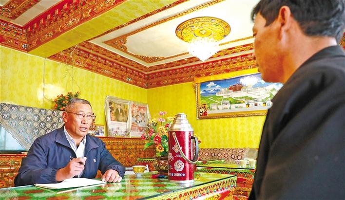 通嘎社區(qū)“四講四愛”宣講員阿瓊在了解米瑪脫貧致富的故事。記者 劉斯宇 格桑倫珠 攝