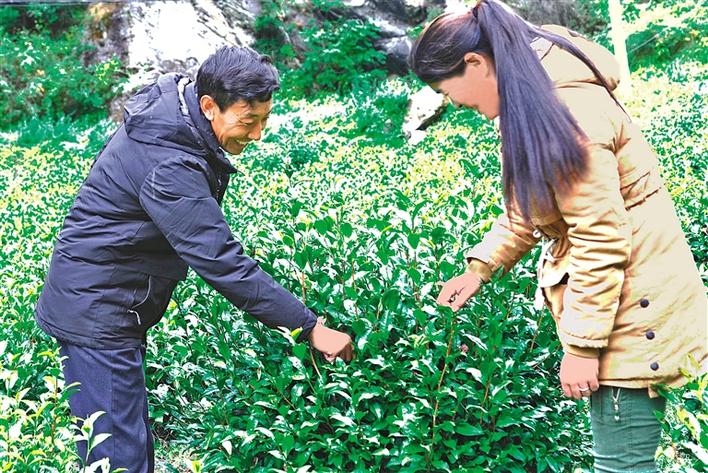 圖為勒門巴民族鄉(xiāng)茶葉農(nóng)牧民專業(yè)合作社理事長羅布次仁(左)和技術(shù)指導(dǎo)達(dá)娃卓瑪在查看茶葉長勢。 記者 段敏 攝