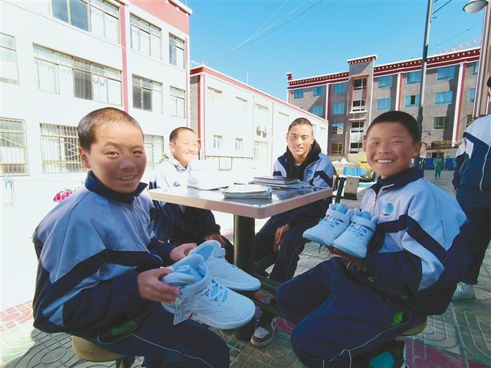 領(lǐng)到運(yùn)動(dòng)鞋的學(xué)生們開心不已。記者 扎西頓珠 攝