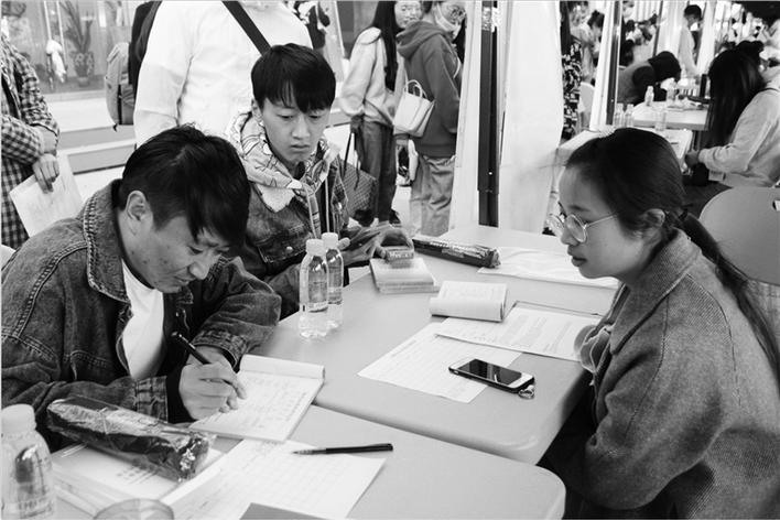 高校畢業(yè)生在招聘會上填寫求職信息。 文/圖 記者 黃苗 周雨龍