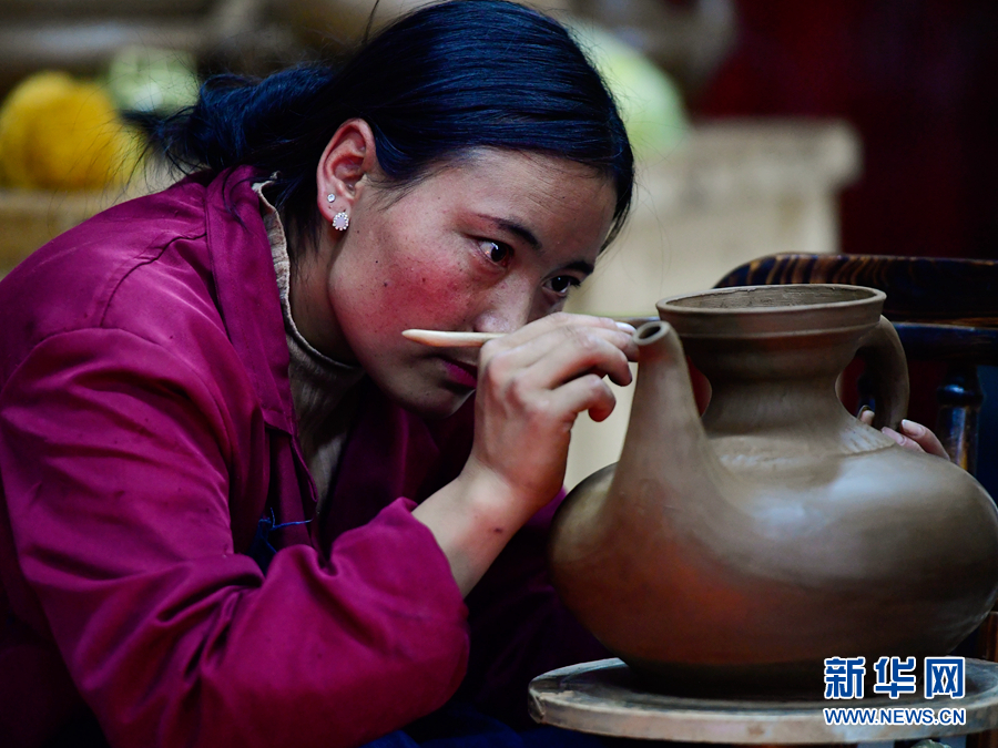 出身黑陶世家的謝格太就是當(dāng)?shù)赜忻暮谔占紟煛?014年,謝格太成立班瑪黑陶旅游產(chǎn)品開發(fā)有限責(zé)任公司,規(guī)?;a(chǎn)和銷售黑陶,并帶領(lǐng)學(xué)徒一起鉆研黑陶技藝,傳承和創(chuàng)新黑陶手工技藝文化。和泥、捏制、打磨、發(fā)酵、火燒、熏黑、拋光,經(jīng)過十幾道工序的磨煉,學(xué)徒們在謝格太的帶領(lǐng)下,不僅學(xué)到了技藝,傳承了技術(shù),每月還能拿到數(shù)千元的生活補(bǔ)助。