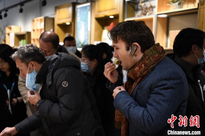 圖為中外嘉賓觀摩隴南市油橄欖產(chǎn)業(yè)時(shí),品嘗加工后的油橄欖果?!¢Z姣 攝
