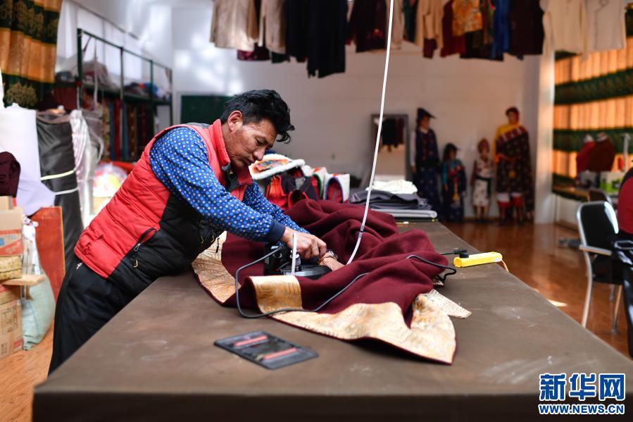 在西藏昌都市江達縣格?;褡宸椉庸やN售公司,江達縣字嘎鄉(xiāng)塔字村村民扎西江措在制作藏裝(4月30日攝)。扎西江措學(xué)習制作藏裝不到兩年時間,已經(jīng)是一名熟練的制衣工,現(xiàn)在每個月有4000多元的收入。新華社記者 詹彥 攝