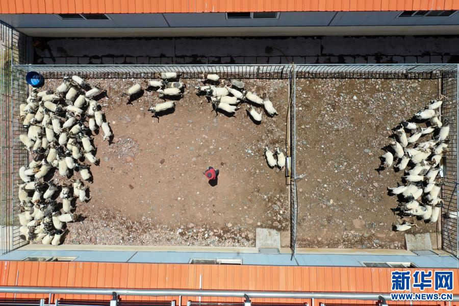 在西藏昌都市貢覺縣莫洛鎮(zhèn)阿旺綿羊繁育基地,阿果村村民色秋在查看綿羊的生長情況(5月2日攝,無人機照片)。2016年,色秋來到阿旺綿羊繁育基地打工,很快就學(xué)會了綿羊的養(yǎng)殖技術(shù),現(xiàn)已成為繁育基地的一把好手,月工資漲到了4400元。新華社記者 詹彥 攝