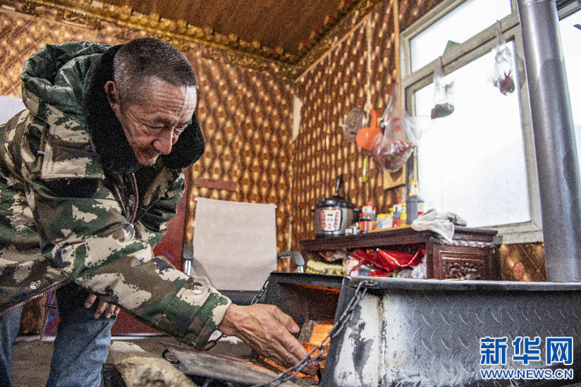 在易貢鄉(xiāng)通加村擔(dān)任村黨支部書記的索朗次仁給爐子生火(4月1日攝)。新華社記者 孫非 攝