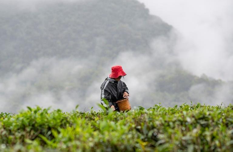 門巴族姑娘貢桑拉姆正在云霧繚繞的茶園里采摘茶青.[詳細(xì)] -