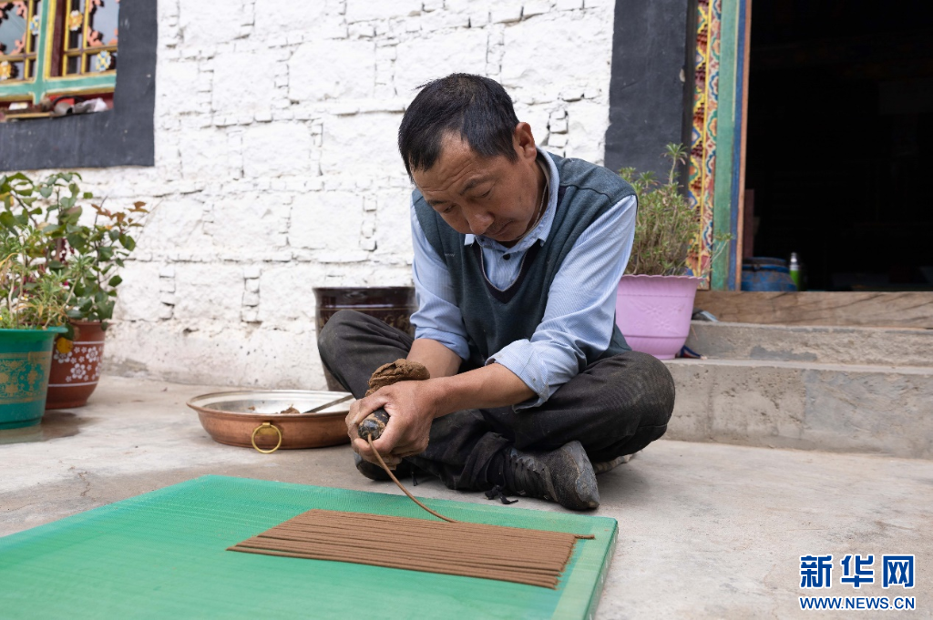 工作時(shí),格桑次仁會(huì)盤(pán)腿坐于門(mén)前,熟練地揉搓著盆中的香泥,待其成型后再迅速放入帶孔的牛角中,用靈巧的手指擠出一道道筆直的線條,一根根均勻的藏香便呈現(xiàn)在人們的眼前。經(jīng)過(guò)晾曬成型之后,這些藏香將會(huì)被送至附近的大小寺廟,或是通過(guò)電商渠道發(fā)往全國(guó)各地。
