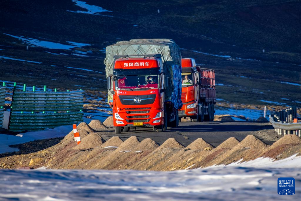 運(yùn)載著申扎縣供銷合作社為偏遠(yuǎn)鄉(xiāng)鎮(zhèn)果蔬配送試點(diǎn)項(xiàng)目從西寧采購(gòu)的50噸新鮮果蔬的貨車經(jīng)過(guò)唐古拉山口(1月3日攝)。新華社記者 曹檳 攝