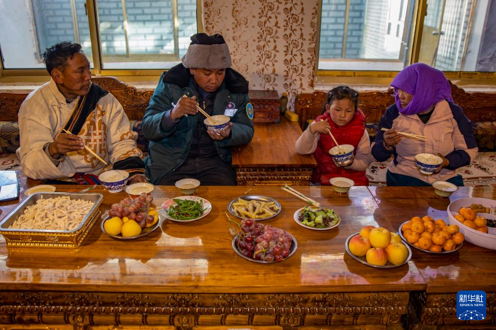 申扎縣馬躍鄉(xiāng)貝嘎四村村民次仁曲達(dá)(左一)家在吃飯,桌上的新鮮蔬菜和水果都是在村里的偏遠(yuǎn)鄉(xiāng)鎮(zhèn)果蔬配送試點(diǎn)項(xiàng)目直銷點(diǎn)采購(gòu)的,由供銷合作社當(dāng)天配送而來(lái)(1月5日攝)。新華社記者 姜帆 攝