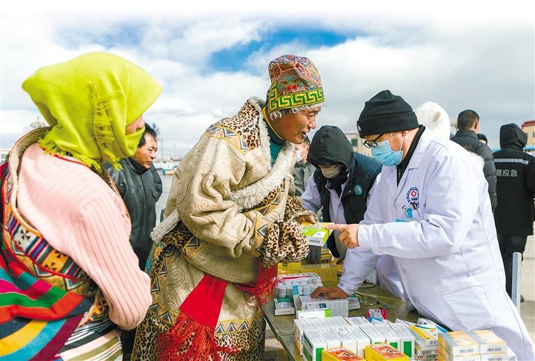 圖為“七送”活動現場,措勤縣人民醫(yī)院醫(yī)生為群眾送醫(yī)送藥。 措勤縣委宣傳部供圖