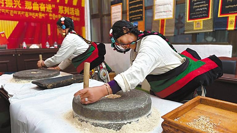 圖為:在第三屆“鄉(xiāng)村振興 那曲奮進(jìn)”農(nóng)牧民技能大賽中,巴青縣農(nóng)牧民參賽選手進(jìn)行手工磨糌粑。 記者 萬(wàn)靖 攝