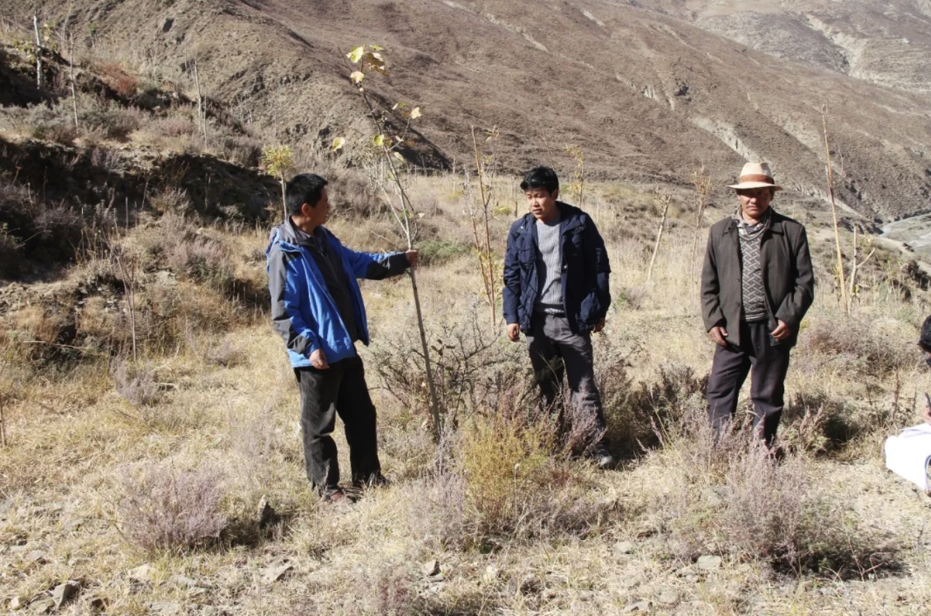 圖為尼瑪次仁(左一)查看樹苗生長(zhǎng)情況。(圖片由受訪者本人提供)