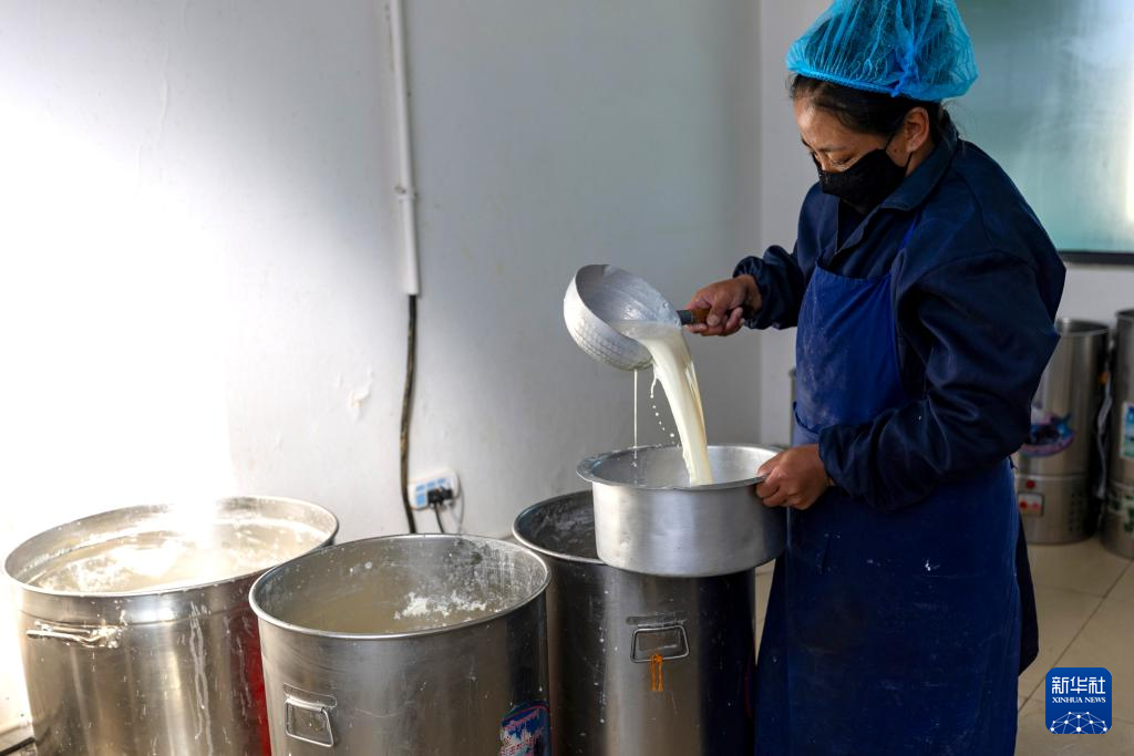 11月28日,在基地就業(yè)的當(dāng)?shù)貑T工索朗卓瑪在用傳統(tǒng)工藝制作奶渣。新華社記者 姜帆 攝