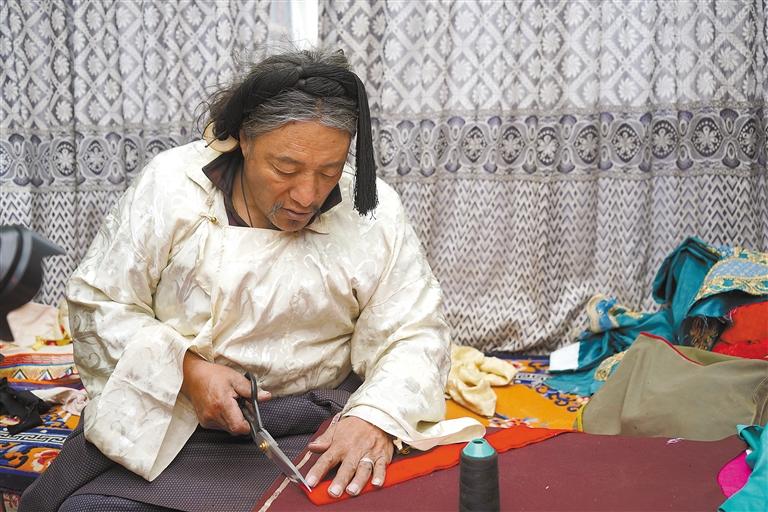“新衣服老大穿,穿舊了給老二,縫縫補(bǔ)補(bǔ)給老三?!贝螝W打趣道,“在以前生活相對(duì)拮據(jù)的時(shí)候,有了這門手藝,家里人即使穿著補(bǔ)丁衣服,御寒倒是不用擔(dān)心了。隨著縫紉手藝越來(lái)越精湛,我會(huì)用舊的布料為家人制作合身的藏裝,漸漸地,街坊鄰居也會(huì)上門找我做衣服,自此我也吃上了‘手藝飯’?!?/p>