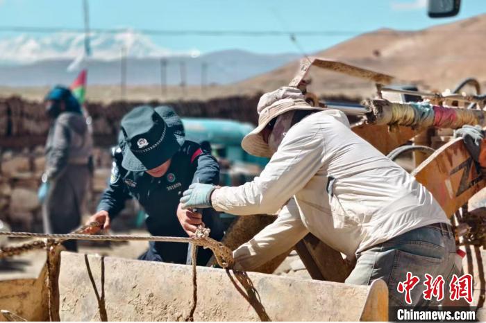 圖為西藏出入境邊防檢查總站第十四批駐村工作隊隊員與當(dāng)?shù)卮迕窆餐_展災(zāi)后重建。徐廣立 攝