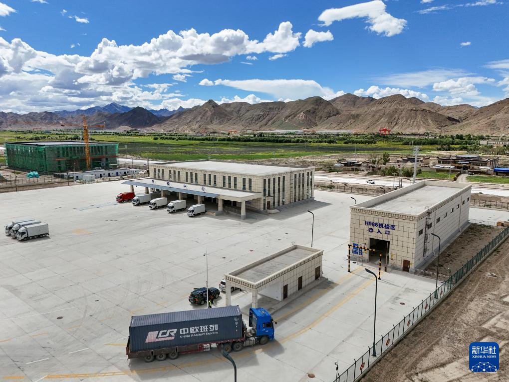 這是7月16日拍攝的日喀則國際陸地港出口貨物查驗(yàn)場(chǎng)(無人機(jī)照片)。新華社記者 李鑫 攝
