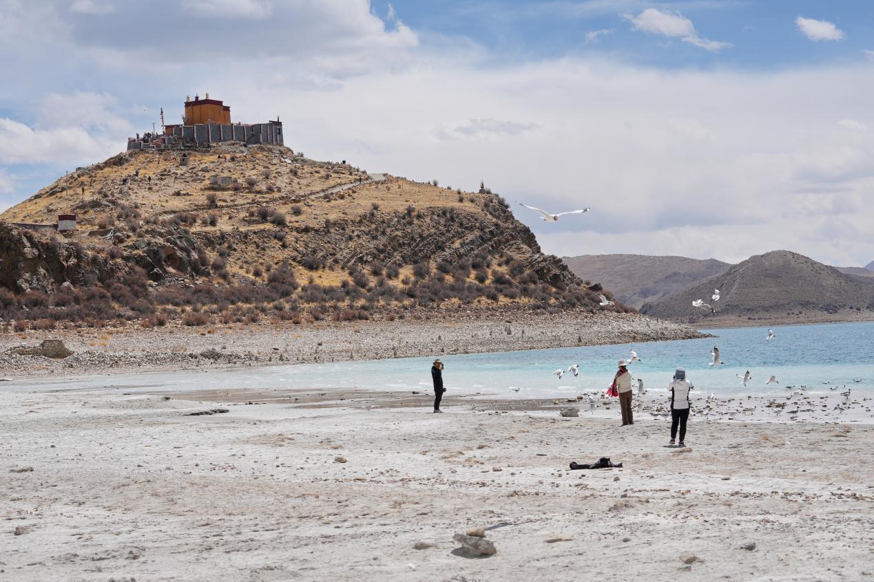 游客在羊卓雍錯北岸的日托寺附近投喂棕頭鷗(2024年4月5日攝)。新華社記者 張汝鋒 攝