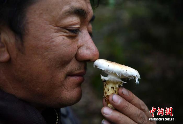 8月28日,扎稱在甘孜州鄉(xiāng)城縣色壩村細嗅松茸。 中新社記者 王磊 攝