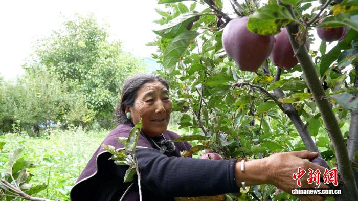 圖為米林市崗嘎村村民白瑪在摘自家種的蘋果。德吉 攝