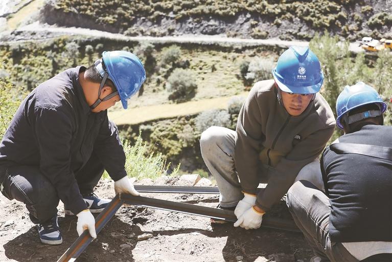 國網(wǎng)仁布縣供電公司技術人員正在施工。文/圖 記者 袁海霞 通訊員 羅布次仁
