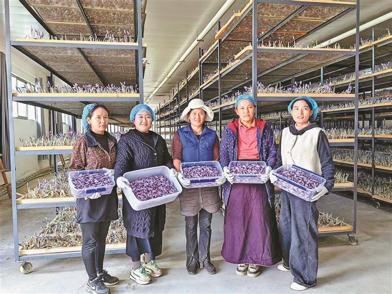 村民格桑旺姆的籃子里,是剛摘下來的藏紅花。藏紅花從開花到凋謝只有短短幾個(gè)小時(shí),如果不及時(shí)采摘,花朵凋謝后就會失去價(jià)值。“在這里上班離家近,一天有200元收入?!备裆M氛f。