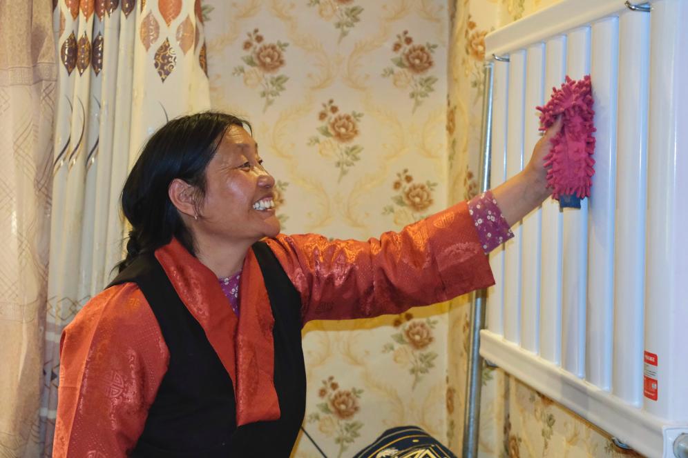11月20日,那曲市色尼區(qū)團結(jié)小區(qū)居民次仁卓瑪在擦拭暖氣片。(周昱龍 攝)