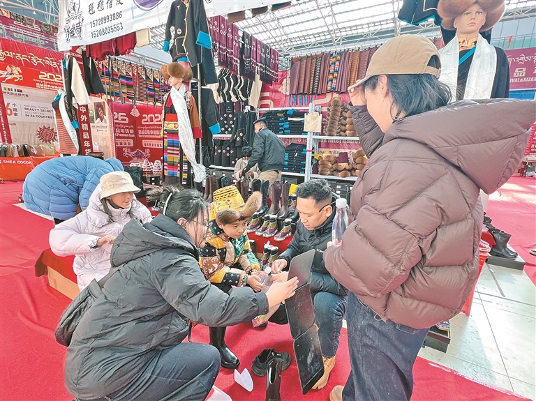 圖為市民在博覽會上為孩子選購藏帽、藏靴。記者 央金 攝