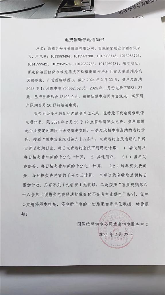 記者從國(guó)網(wǎng)拉薩供電公司城南供電服務(wù)中心了解到,上述5個(gè)小區(qū)均由同一家物業(yè)公司負(fù)責(zé)代收電費(fèi),2024年1月份、2月份的電費(fèi)皆未繳納,涉及電費(fèi)逾百萬(wàn)元。供電公司于2月份、3月份連續(xù)向該物業(yè)公司發(fā)布《電費(fèi)催繳停電通知書》,通知書明確:“請(qǐng)您在接到本通知后,務(wù)必于最后繳費(fèi)日期2024年3月31日12:30之前,前往我公司指定的繳費(fèi)地點(diǎn)或通過(guò)網(wǎng)絡(luò)平臺(tái)完成電費(fèi)繳納工作。逾期未繳,2024年3月31日13:00采取停限電措施,所產(chǎn)生的一切后果由貴單位承擔(dān)。”但截至3月31日12:30,該物業(yè)公司仍未繳費(fèi),才導(dǎo)致了小區(qū)被斷電。