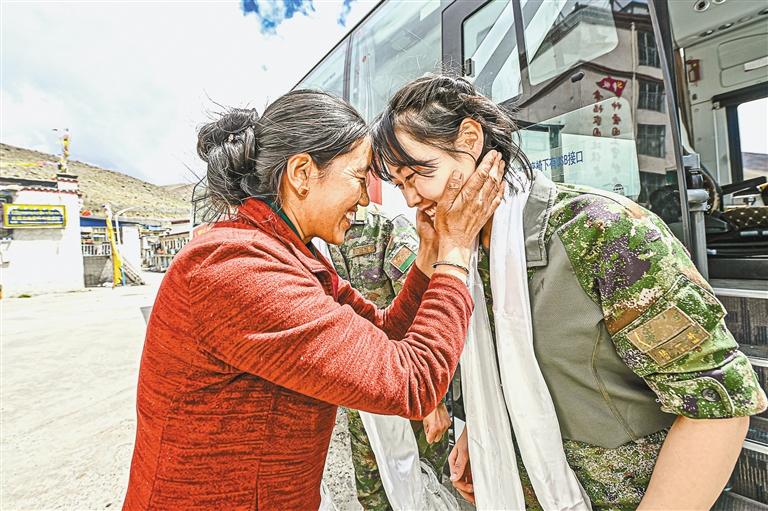 圖為村民送別珠峰文藝輕騎隊時,為他們送上哈達。 西藏日報記者 楊子彥 西藏日報通訊員 何曙 劉煜欽 攝