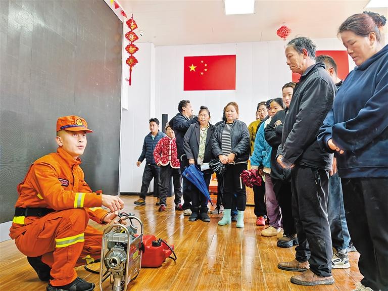 圖為消防員向當(dāng)?shù)厝罕娭v解消防器材的使用方法。 記者 楊小娟 通訊員 蔡安 攝