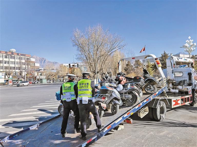 圖為拉薩交警正在清理超標(biāo)電動(dòng)車。