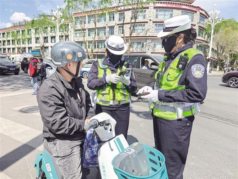 “騎乘電動車請戴好頭盔?!薄靶腥诉^馬路不要闖紅燈。”4月27日下午,記者來到拉薩市江蘇路、金珠東路、康昂多南路三岔口,看到拉薩市公安局交警支隊城北大隊的民警正在路口疏導(dǎo)交通,并針對電動車駕駛員未佩戴安全頭盔等情況,進行現(xiàn)場查糾。
