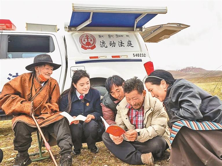 安多縣人民法院雁石坪法庭干警和流動法庭來到牧區(qū)草場,進(jìn)行巡回普法。