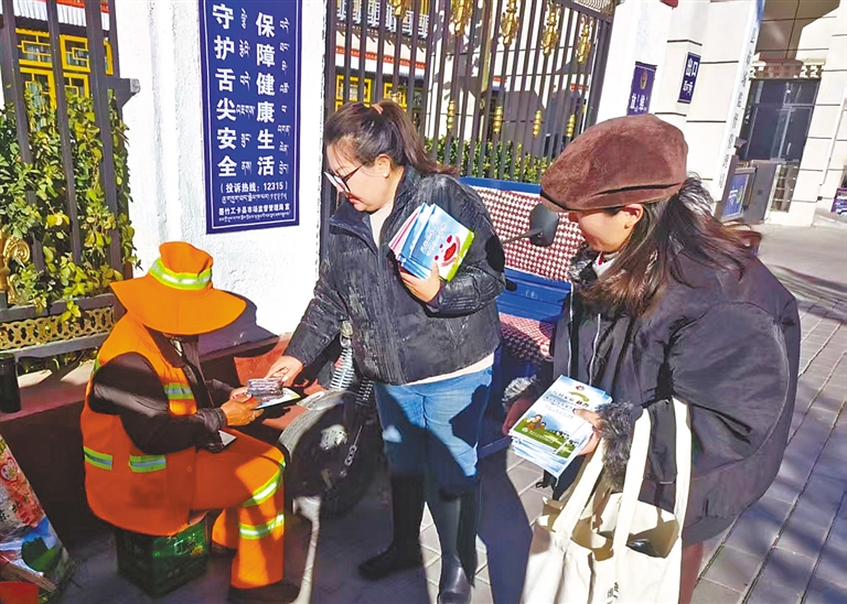 墨竹工卡縣群團(tuán)工作部婦聯(lián)工作人員向環(huán)衛(wèi)工人發(fā)放反家庭暴力宣傳手冊(cè)。
