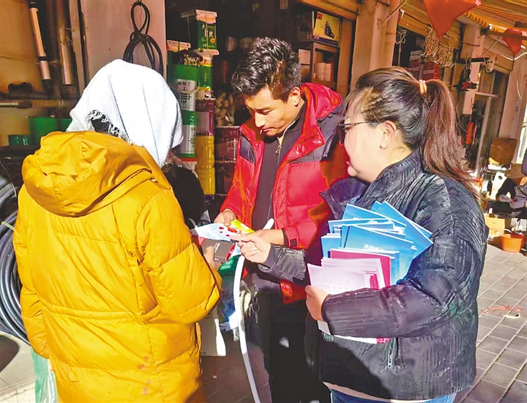 墨竹工卡縣群團(tuán)工作部婦聯(lián)工作人員走進(jìn)商戶(hù)發(fā)放反家庭暴力宣傳手冊(cè)。記者 格桑倫珠 攝
