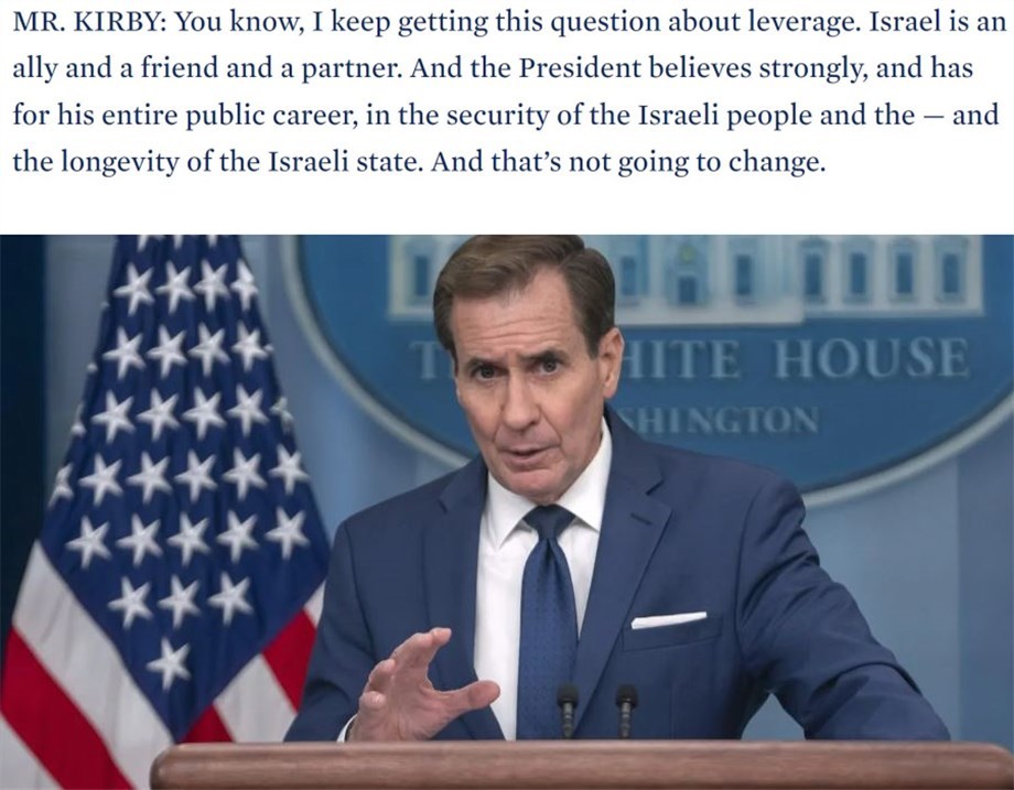 白宮國家安全委員會戰(zhàn)略溝通協(xié)調員柯比當天在記者會上被反復追問“美國是否會切斷對以色列的武器供應”時一味回避躲閃,但在回答美以關系問題時卻斬釘截鐵。