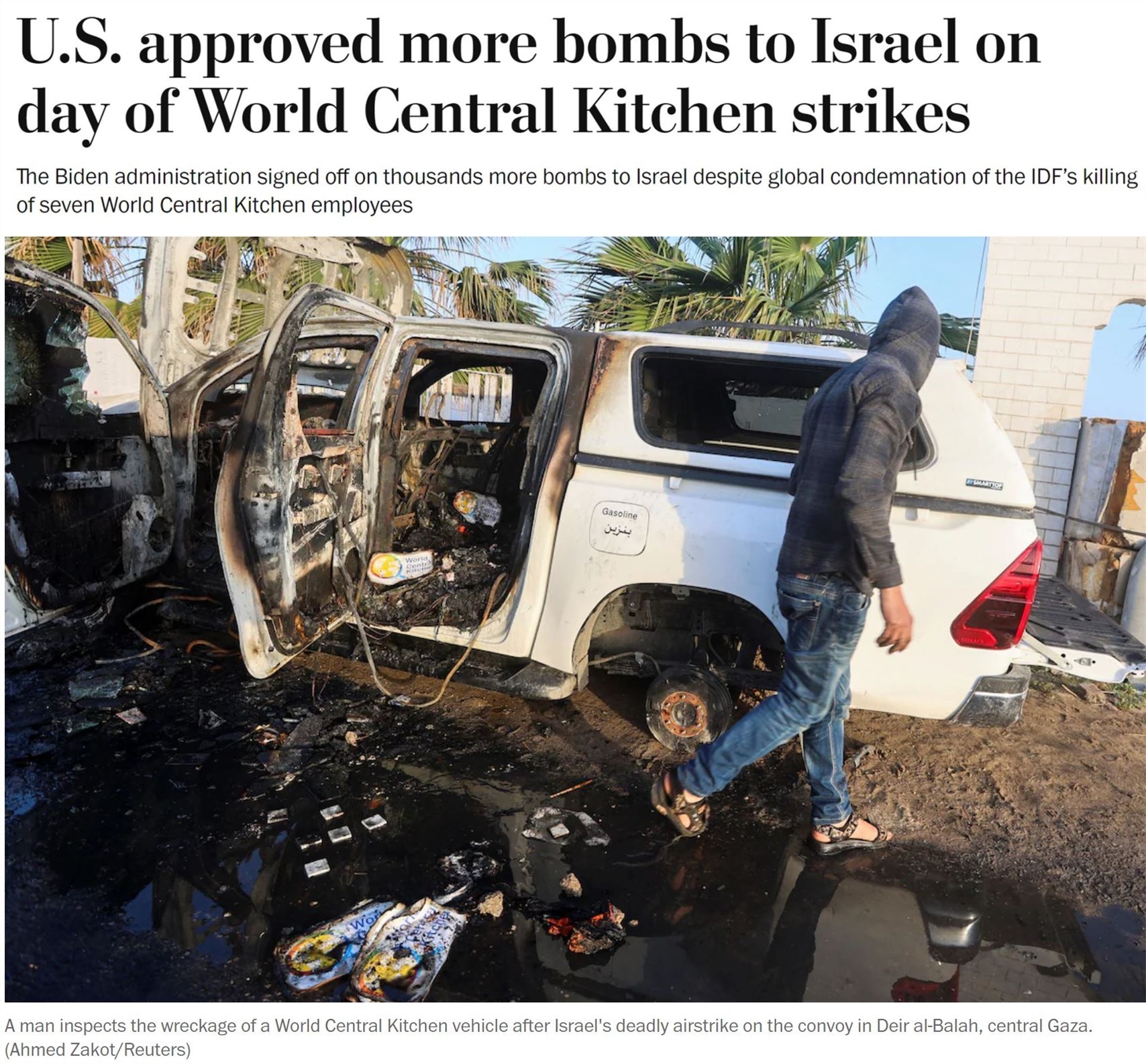 據(jù)美媒報道,就在以軍襲擊國際慈善組織的同一天,美國批準再向以色列提供數(shù)千枚炸彈。