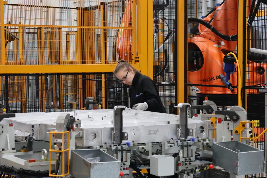 2月23日,在法國(guó)呂茨,中國(guó)敏實(shí)集團(tuán)與法國(guó)雷諾集團(tuán)成立的合資公司的員工在電池盒產(chǎn)線上工作。新華社記者張百慧攝