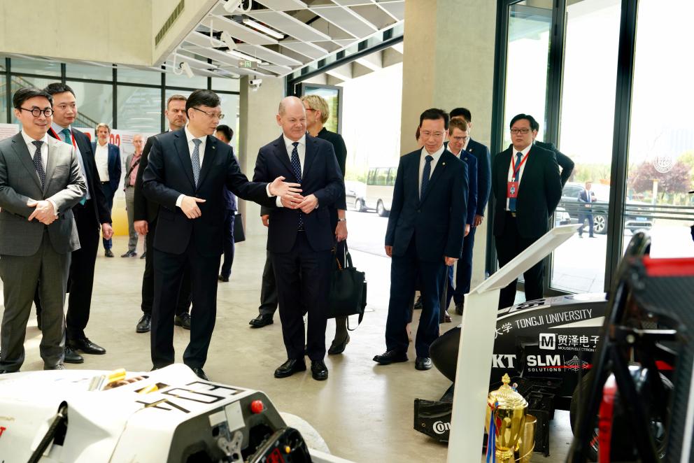4月15日,德國(guó)總理朔爾茨(前排左三)在上海參觀同濟(jì)大學(xué)科研創(chuàng)新作品。新華社記者高峰 攝