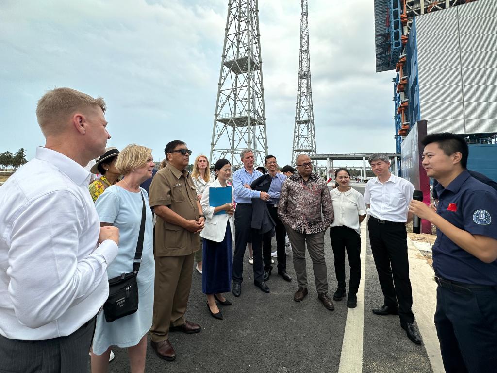23日下午,使節(jié)團(tuán)走進(jìn)了正在建設(shè)中的海南國際商業(yè)航天發(fā)射中心現(xiàn)場,站在已經(jīng)竣工的一號發(fā)射工位旁,使節(jié)們紛紛掏出手機,從不同角度拍攝高聳入云的發(fā)射塔架。不等工作人員講解,不少使節(jié)圍上前問出心中的好奇。