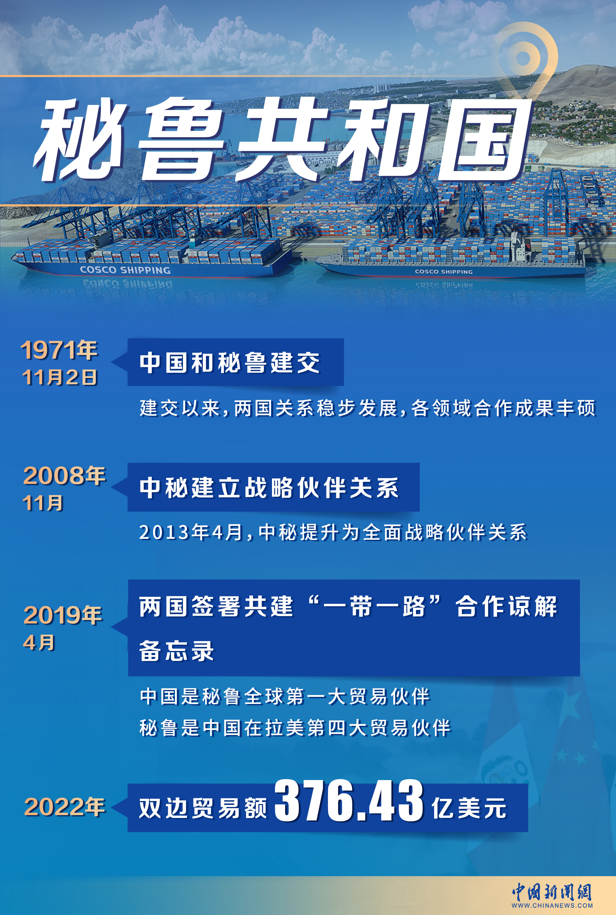 2022年,中秘雙邊貿(mào)易額達376.43億美元,目前,中國是秘魯全球第一大貿(mào)易伙伴、第一大出口市場和第一大進口來源國,秘魯也是中國在拉美第四大貿(mào)易伙伴。