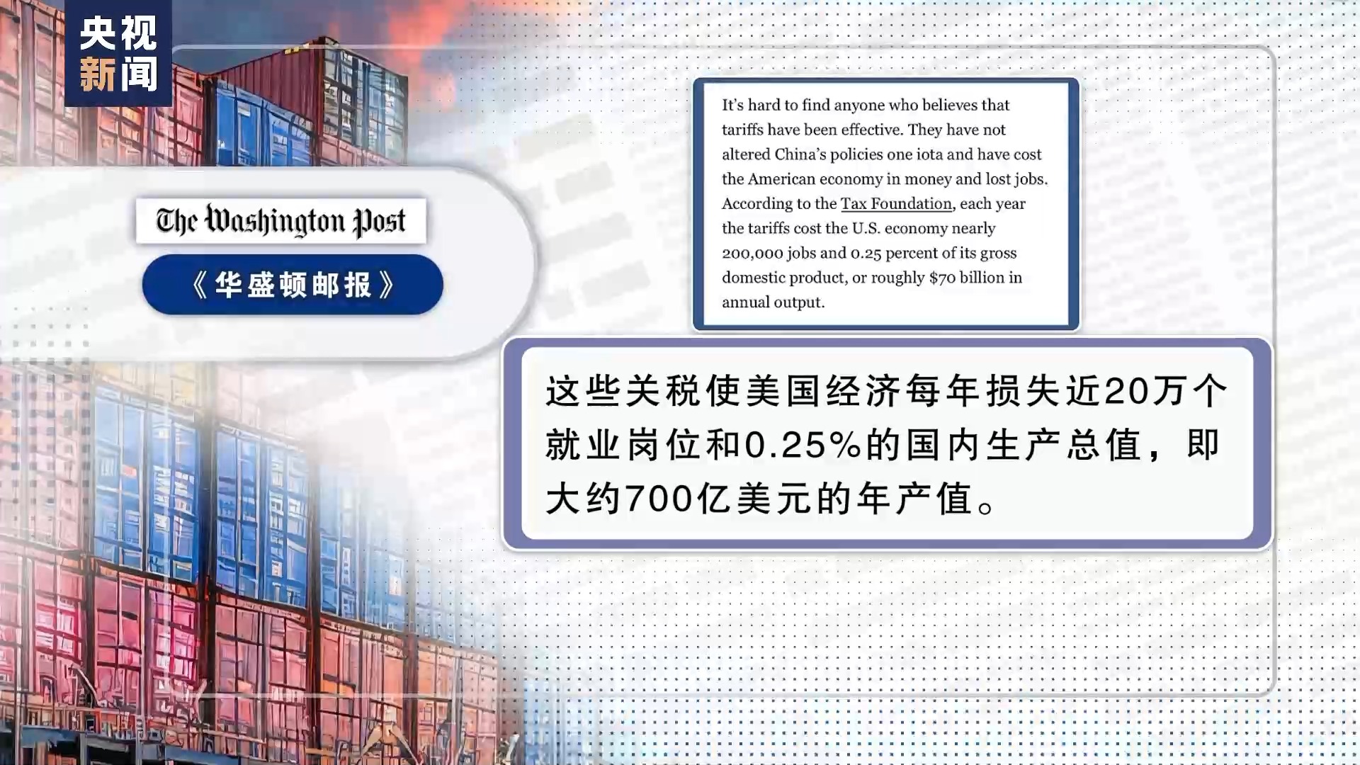 另?yè)?jù)美國(guó)《華盛頓郵報(bào)》4月援引美國(guó)稅務(wù)基金會(huì)的數(shù)據(jù),這些關(guān)稅使美國(guó)經(jīng)濟(jì)每年損失近20萬(wàn)個(gè)就業(yè)崗位和0.25%的國(guó)內(nèi)生產(chǎn)總值,即大約700億美元的年產(chǎn)值。