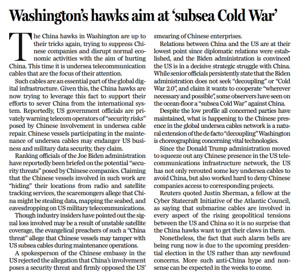 海底光纜是全球數(shù)字基礎(chǔ)設(shè)施的基礎(chǔ)組成部分。對華鷹派們正利用這一點(diǎn)大做文章,為自己試圖把中國從全球體系中分離的行徑找理由。據(jù)報美國政府一些官員已私下向電信運(yùn)營商們發(fā)出警告,稱讓中國參與海底光纜維修可能會引發(fā)“安全風(fēng)險”,并稱參與海底光纜維護(hù)的中國船只可能“危及美國商業(yè)和軍事數(shù)據(jù)安全”。