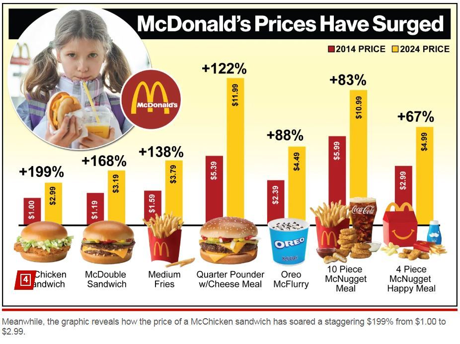以麥當勞經(jīng)典單品雙吉漢堡為例,2014年的平均價格為1.19美元,現(xiàn)在卻賣到3.19美元,漲價幅度高達168%。