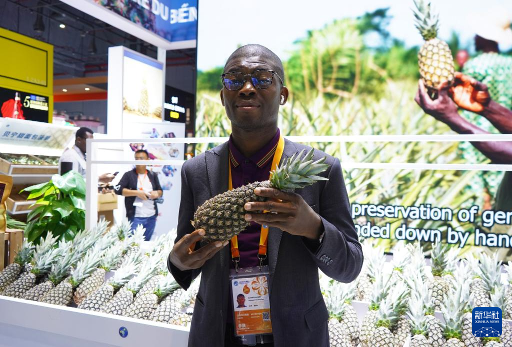 2023年11月8日,在第六屆進博會食品及農產品展區(qū)貝寧菠蘿展臺,工作人員愛力舍展示貝寧菠蘿。這是貝寧菠蘿第一次參加進博會。新華社記者 金皓原 攝