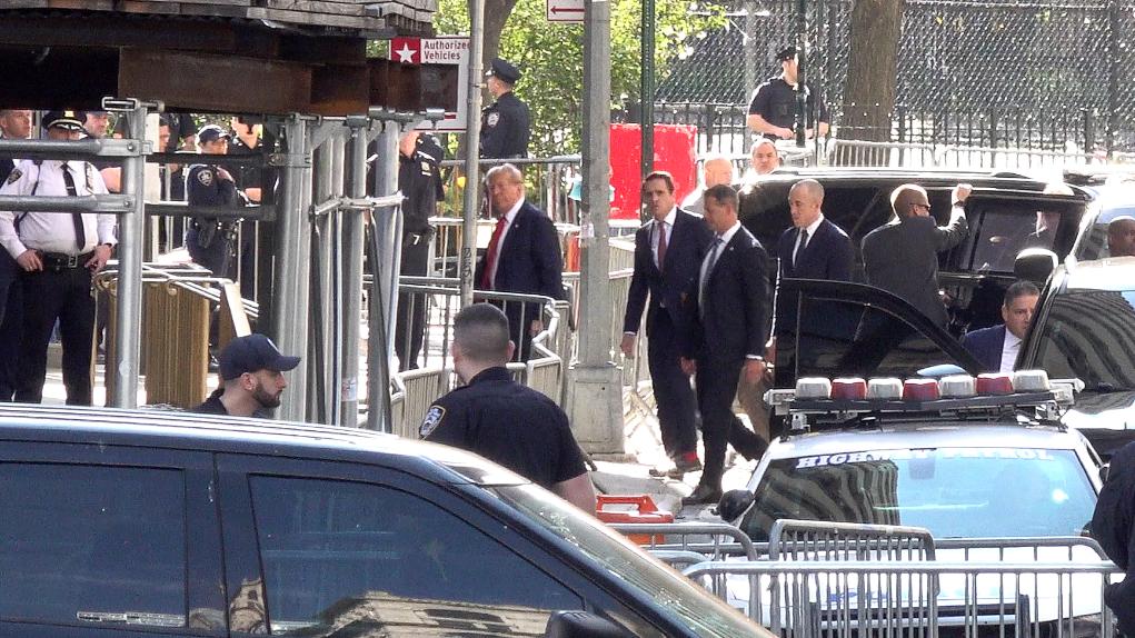 這張4月15日的視頻截圖顯示,美國前總統(tǒng)特朗普抵達(dá)紐約曼哈頓一家刑事法院出庭。新華社記者 丁曄 攝